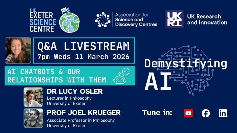 Wednesday 11 March: AI Chatbots & our relationships with them – with Dr Lucy Osler and Prof Joel Krueger, Philosophy lecturers and researchers at the University of Exeter. Find out about what AI chatbots are, and explore the philosophy and ethics around ‘relationships’ we form with them – including their applications for grief and dementia. Watch on YouTube, LinkedIn and Facebook.